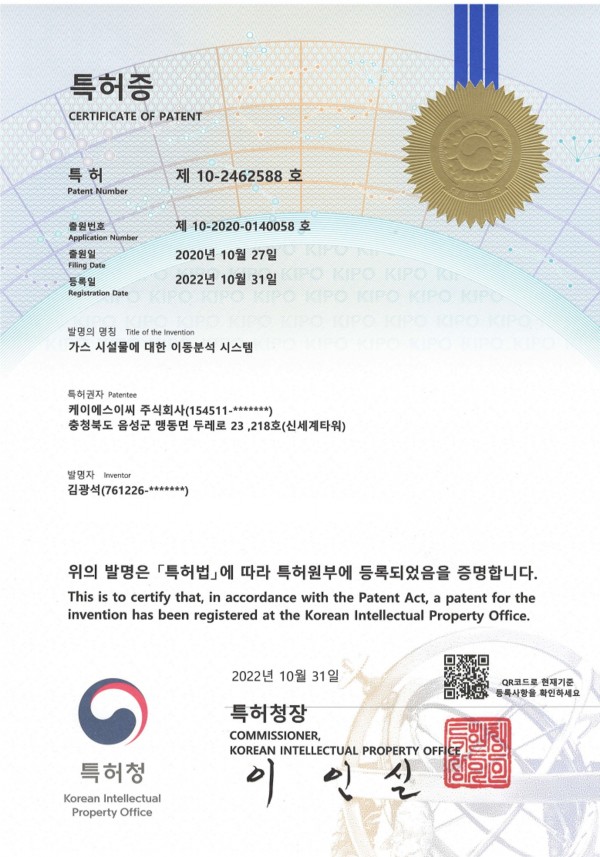 가스시설 물에 대한 이동분석 시스템 특허(10-2462588) 등록