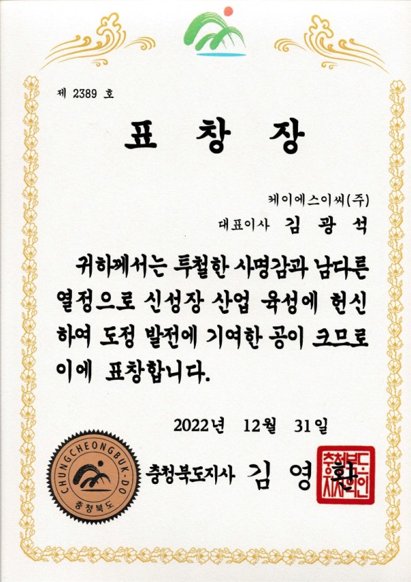 신성장 산업 육성 공헌 관련 충북도지사 표창